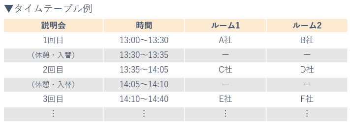 ※ルーム数(同時説明社数)、1回あたりの説明時間はセミナー毎に異なります。